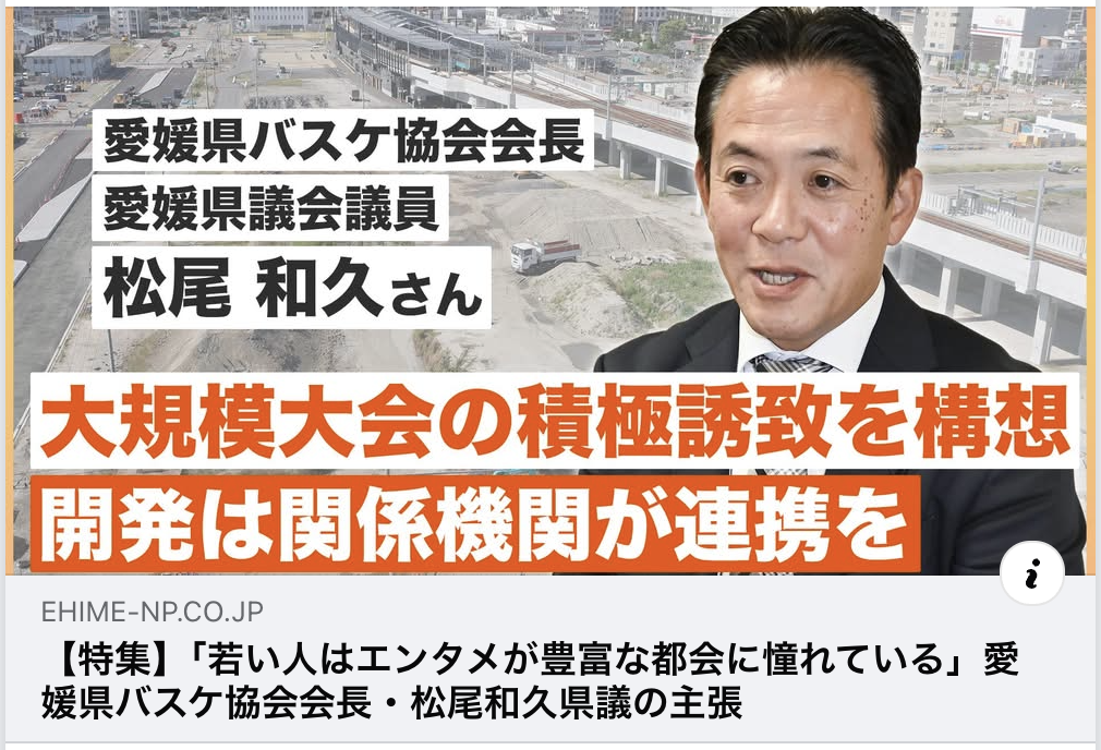 愛媛県バスケットボール協会会長としてアリーナ建設についてのインタビューを受け、記事にしていただきました。